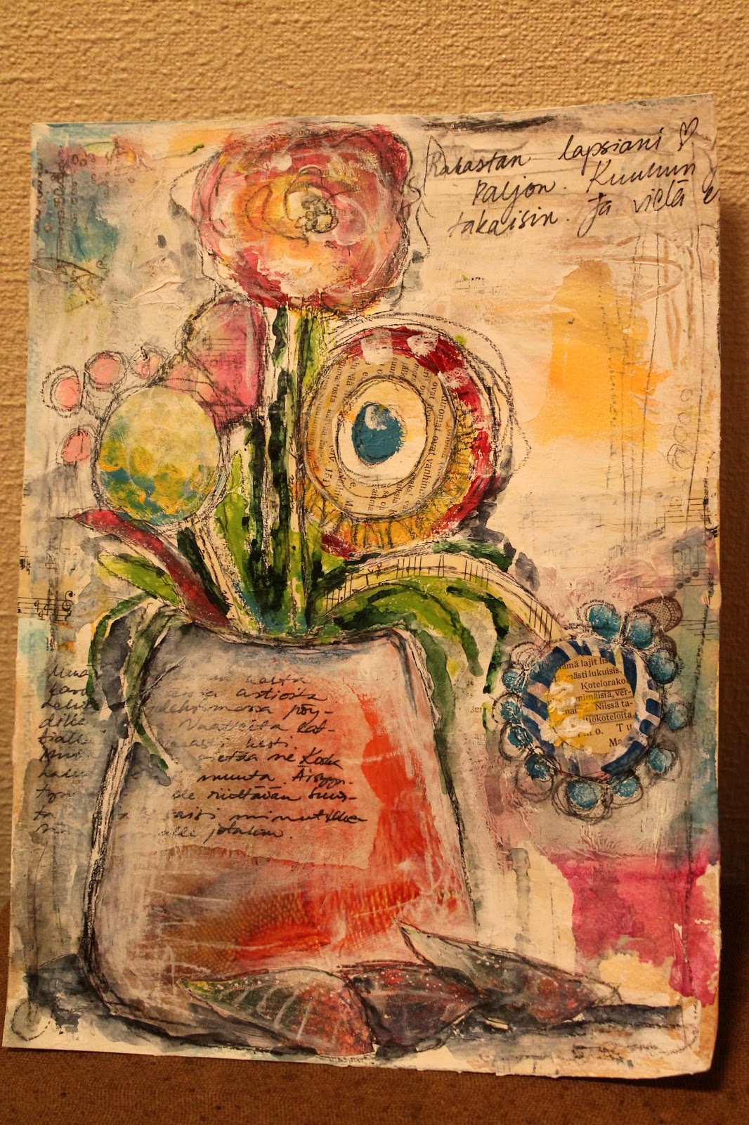 Sitten on gessoa, leikkeleitä lehdestä ja gelliprinttejä ja Stabilo All kynää, akryylimaalia ja vesiväriä lisää. Hämmentävää tässä on se, että minä tykkään tästä lopputuloksesta, vaikken mikään kukkatyttö olekaan ...